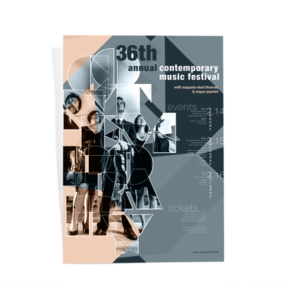 These poster, web and merchandise designs are for the 36th Annual Contemporary Music Festival with Augusta Read Thomas and the Argus Quartet. The designs feature an image of the Argus Quartet worked into a mildly abstracted “contemporary”.