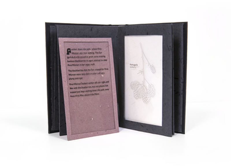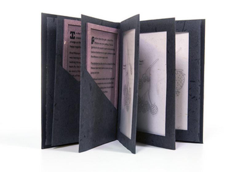 This is a handmade book about the origin story of the strawberry according to the Cherokee people. I wanted to utilize handmade paper in neutral tones with delicate illustrations to try to capture the idea that this story has been told and passed down through countless generations since it's own origin.