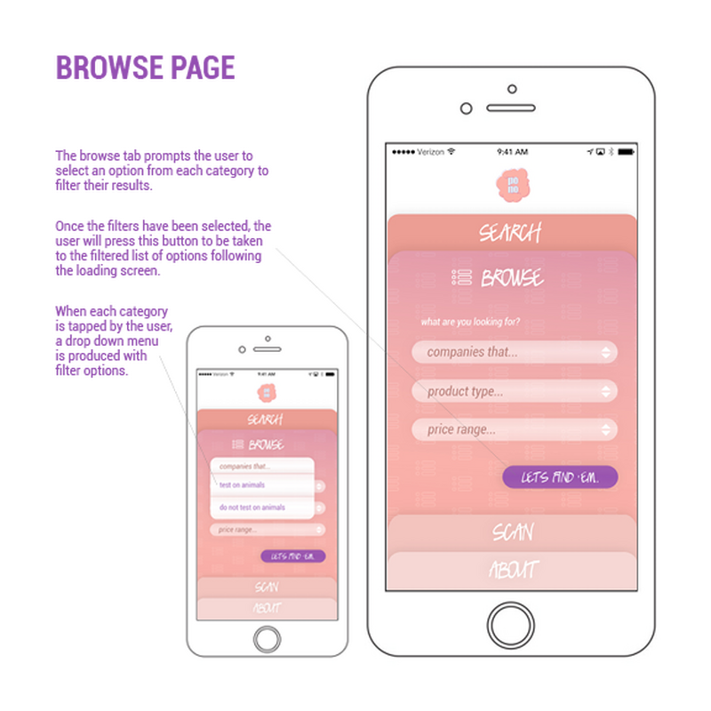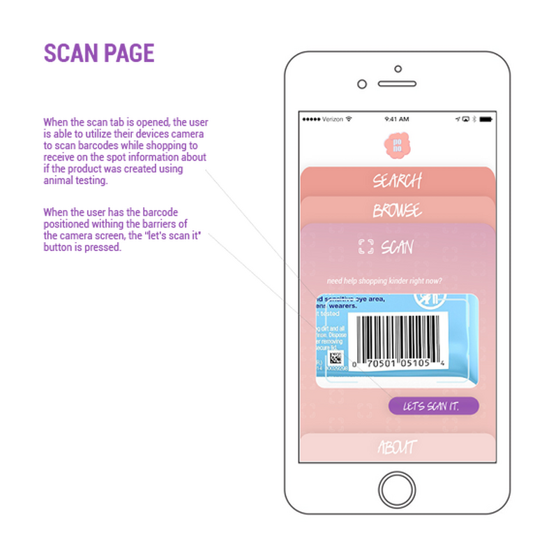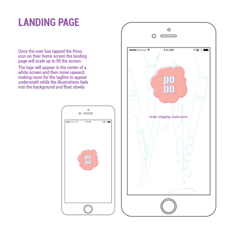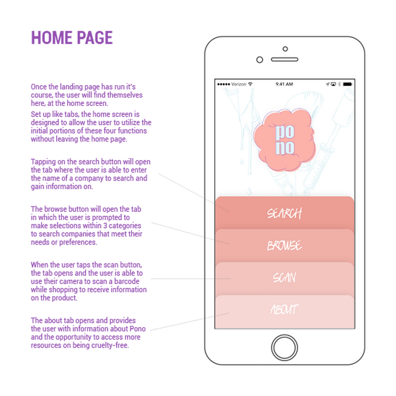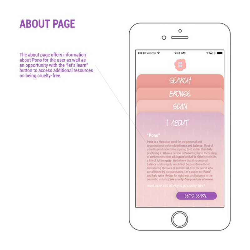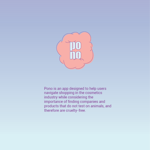 PONO is an app designed to help consumers navigate the cosmetic industry while considering the importance of shopping with companies that do not test their products on animals. When approaching the design for this project I wanted to keep it clean in a way that feels sanitary, while still having a fun and playful element.